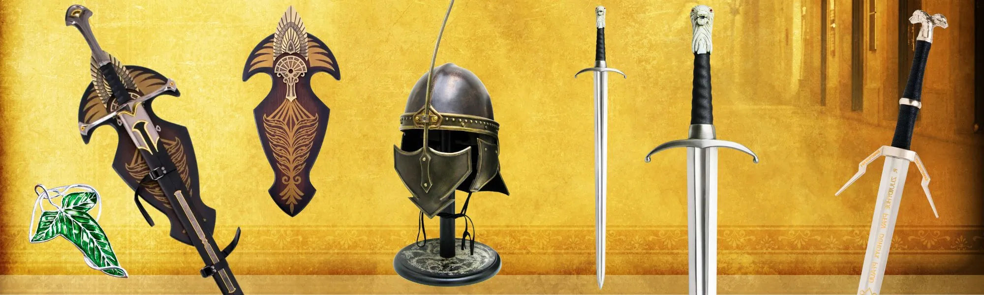 This collection pays homage to the great works of modern fantasy: The Lord of the Rings , The Hobbit , Game of Thrones , The Witcher , Conan the Barbarian , and Harry Potter . Each saga is represented with its iconic weapons , amulets of power , and symbols of lineage , faithfully recreated with artisanal craftsmanship and high-quality materials.