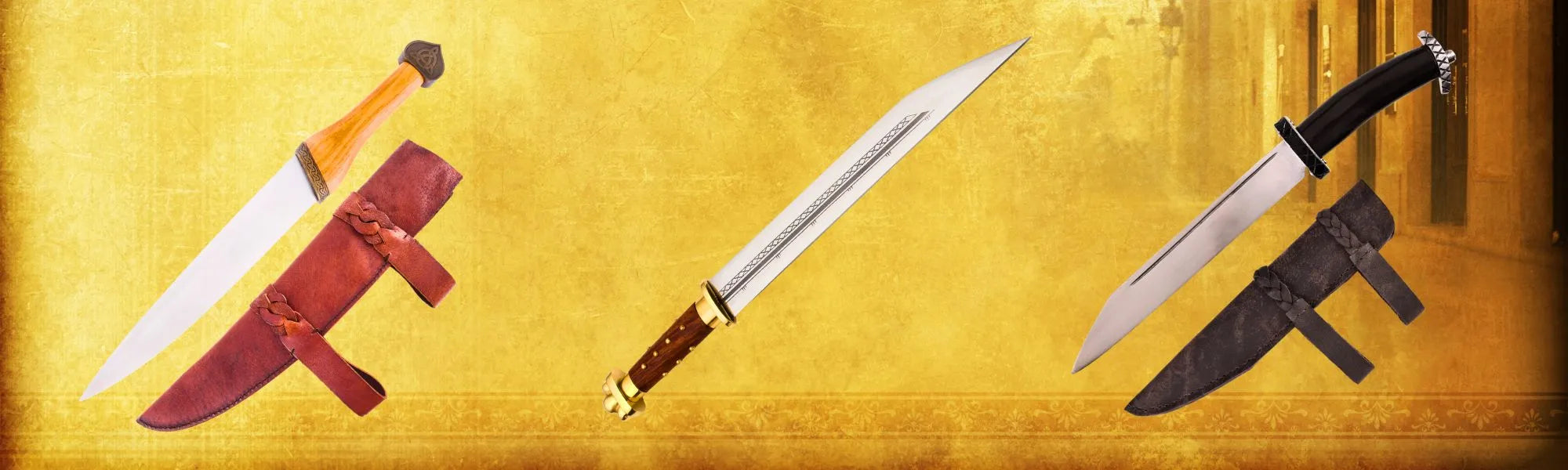 As adagas vikings evocam os mitos de Odin, Thor e dos deuses de Valhalla, mas também a verdadeira história de invasões, conquistas e povoações. Os seus cabos, adornados com motivos rúnicos, cabeças de dragão ou símbolos tribais, fazem de cada peça um item de colecção imbuído de identidade cultural.