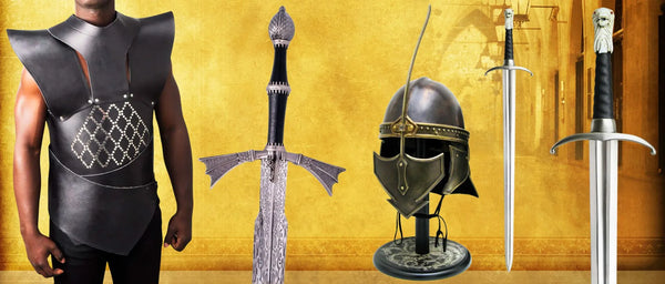 Elaboradas con acero inoxidable o acero al carbono, empuñaduras revestidas en cuero y adornadas con detalles en latón o bronce envejecido, estas piezas combinan autenticidad y resistencia. Algunas incluyen vainas decoradas, bases expositores o grabados con los emblemas de las casas, logrando una fidelidad cinematográfica única. Los colgantes y accesorios se presentan en metal fundido, evocando el arte y la simbología de Poniente.
